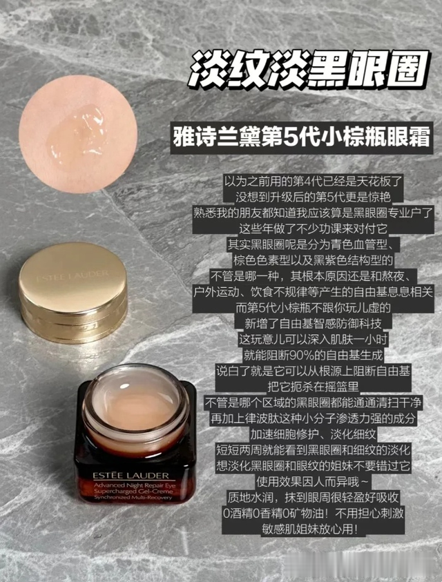 小棕瓶是我人生中买的第一瓶大牌眼霜,尤其是整天对着手机电脑导致的疲劳眼周,用它可以舒缓一下,调节眼周加快循环,眼周的黑青眼圈可以多按摩+热敷。