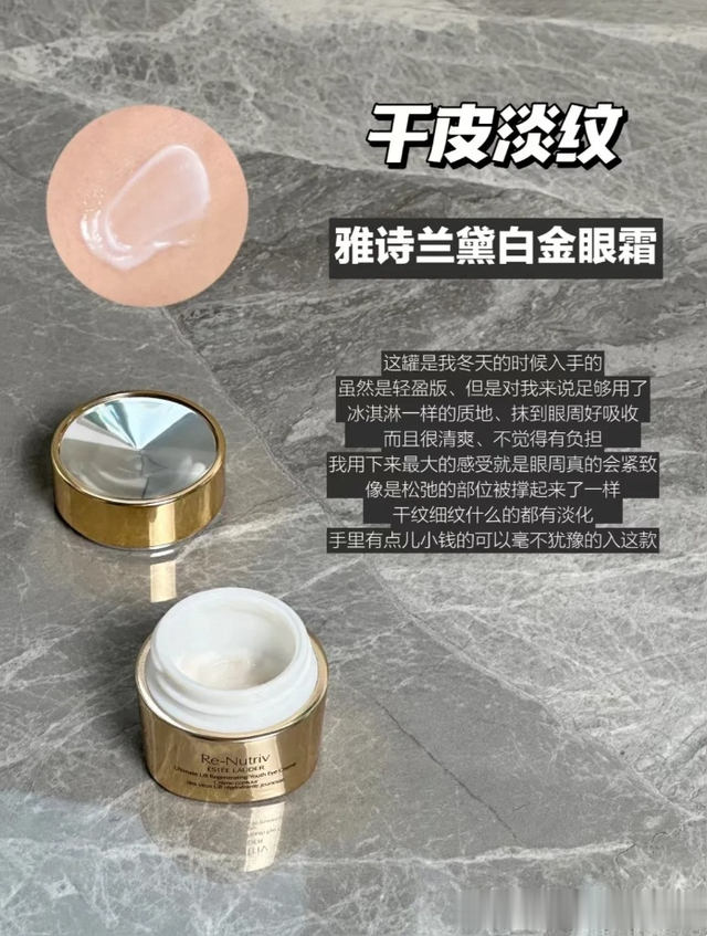 雅诗兰黛的白金系列,对付抗老真的是有两把刷子的,眼霜的质地更轻薄一些,冰激凌般丝滑质地,软软糯糯一抹瞬间吸收,里面的成分大多都是独家的。