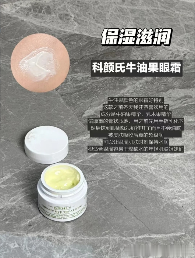 眼睛周围爱长小纹纹就是因为太干燥的原因,科颜氏的牛油果眼霜,采用的是“油包水”的技术,偏奶油的质地,需要乳化之后再上眼,满满的牛油果、向日葵籽油还有VE。